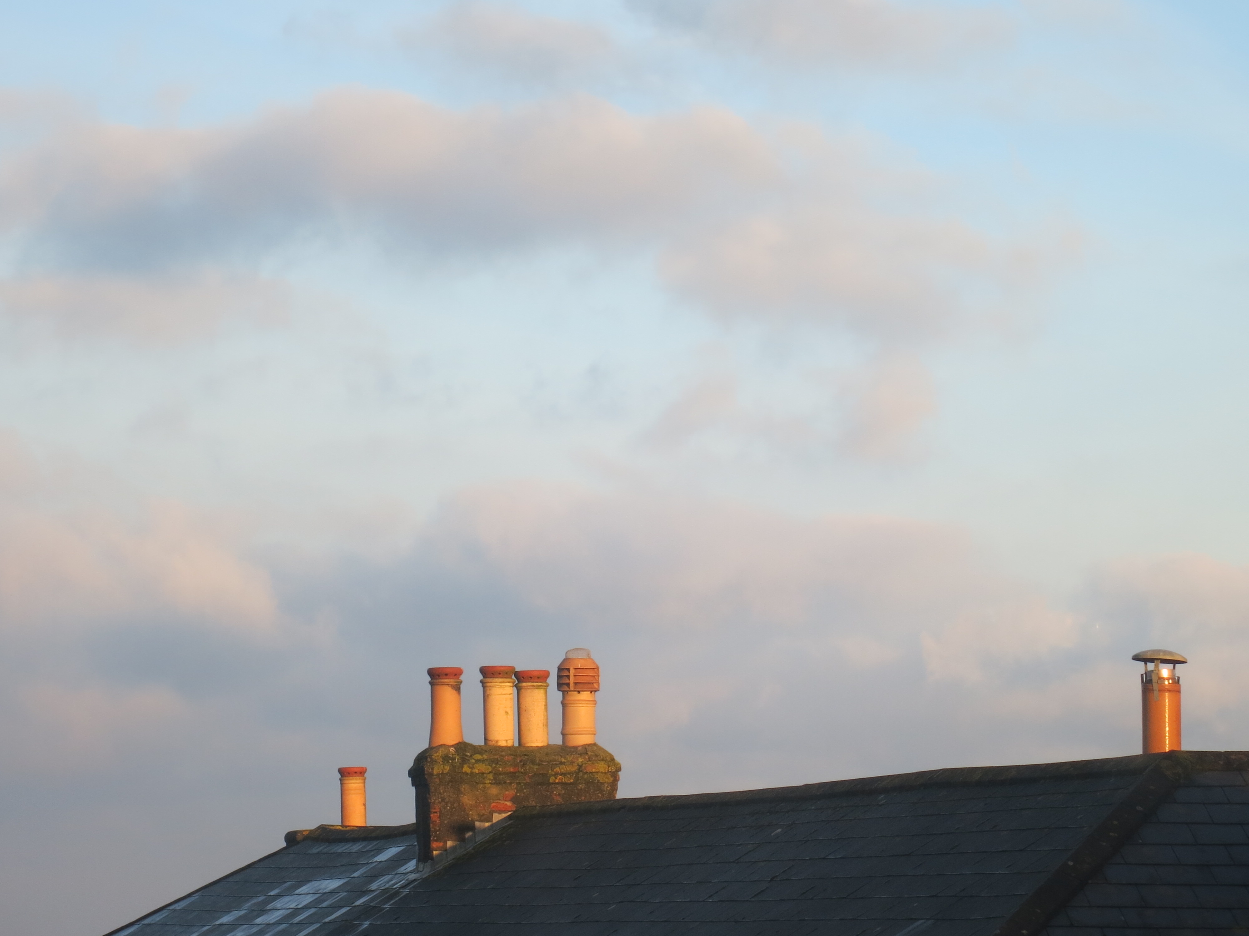 Chimneys across the road turned gold by the rising sun