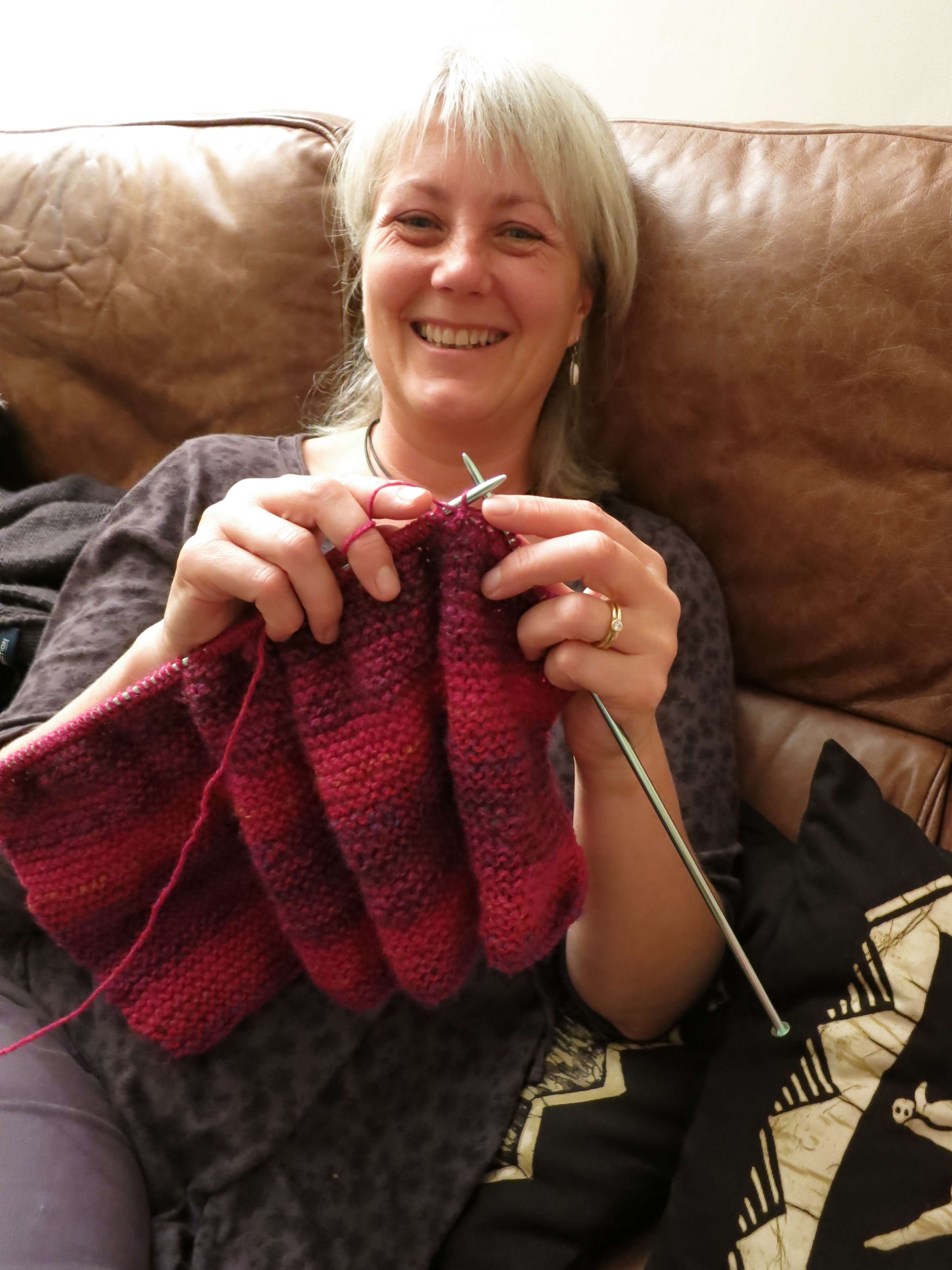 Nicky knitting and laughing