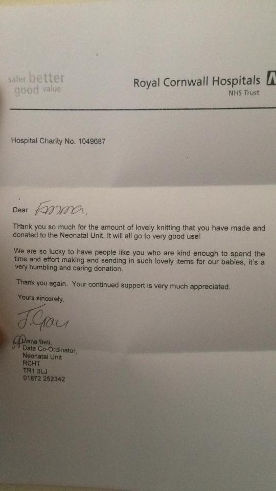 Thank you note from Neo Natal Unit re knitting