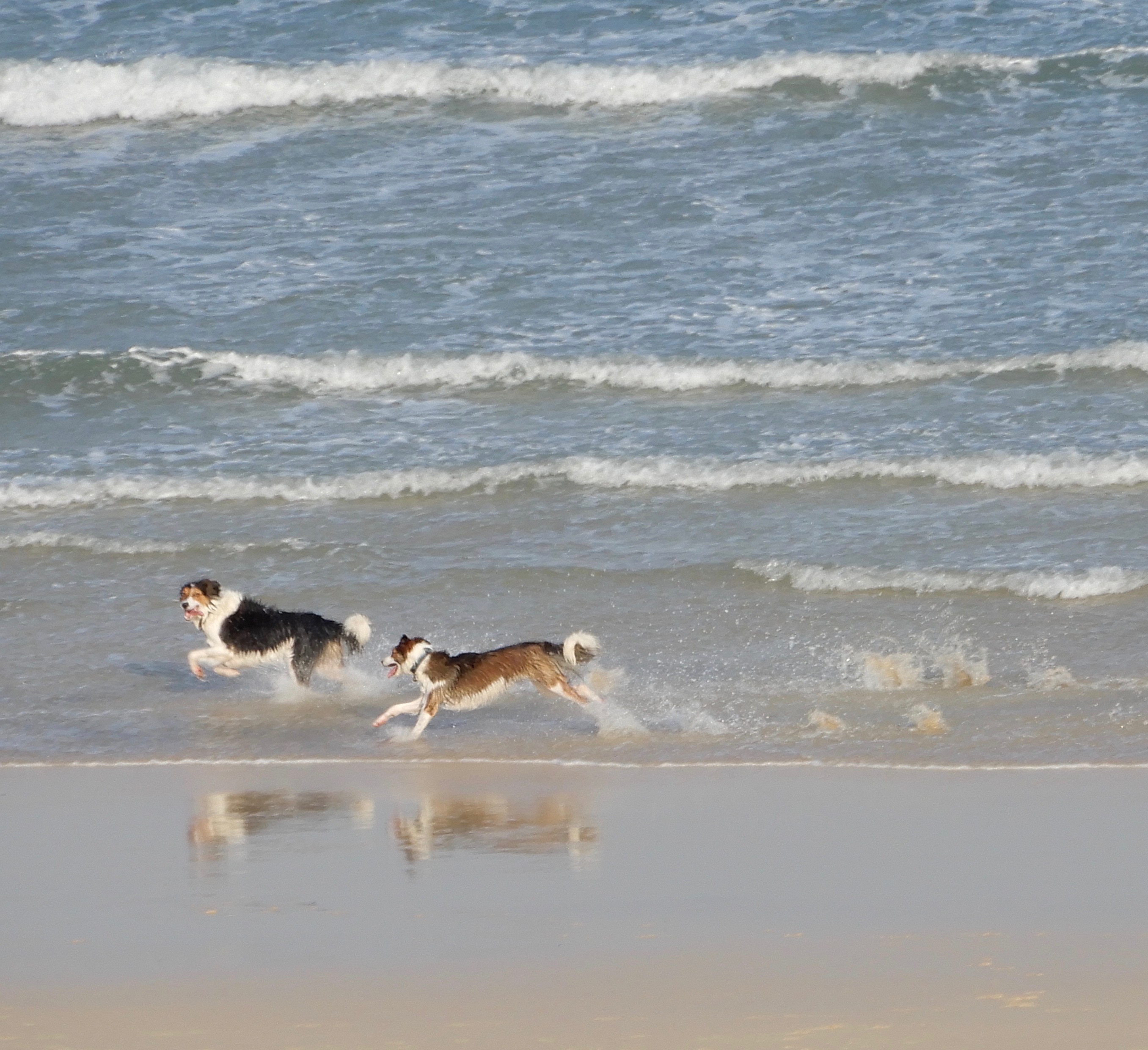 Dogs dashing through the waves