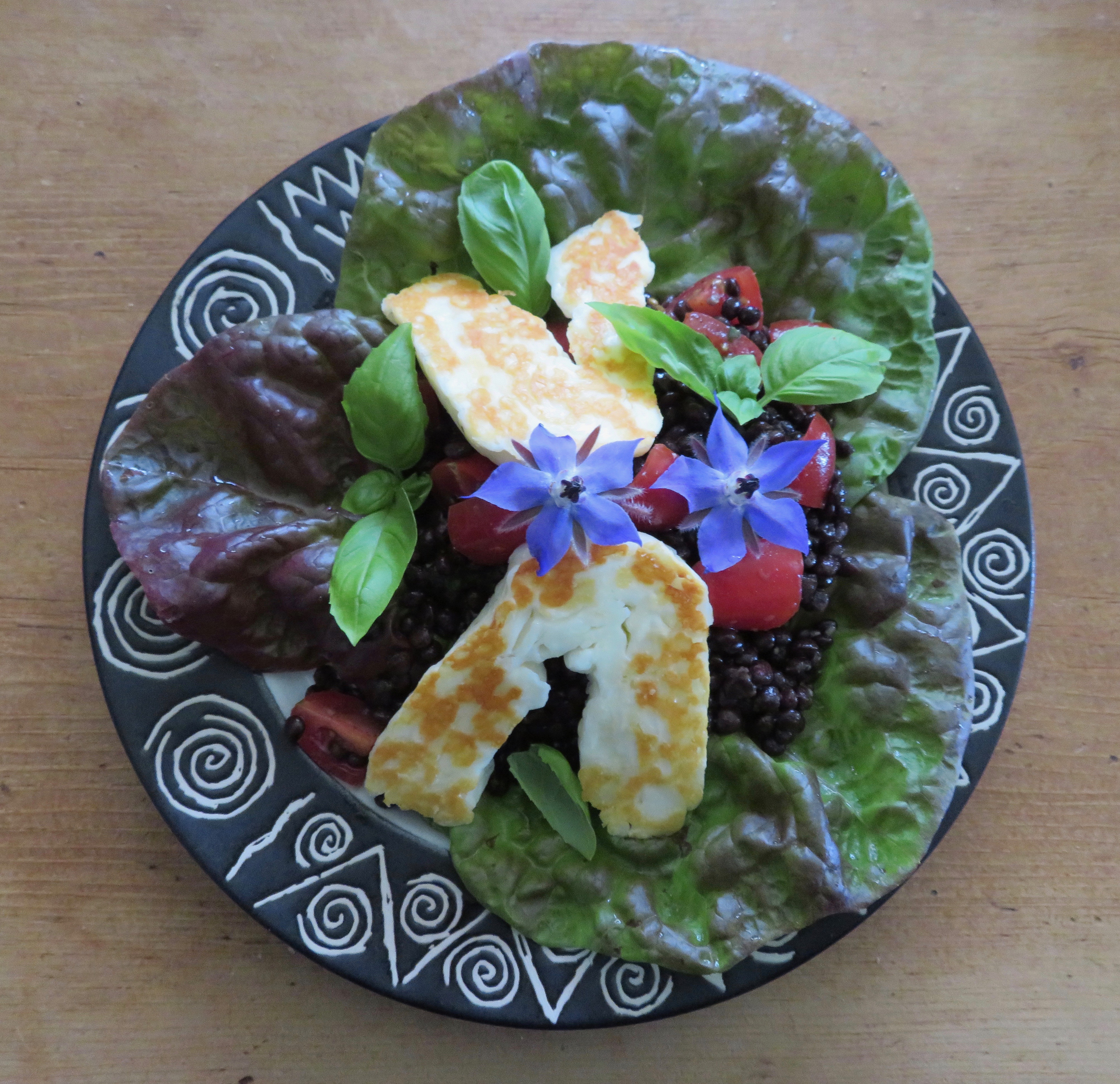 Lentil and Tomato salad with fried Halloumi, decorated with basil leaves and Borage flowers